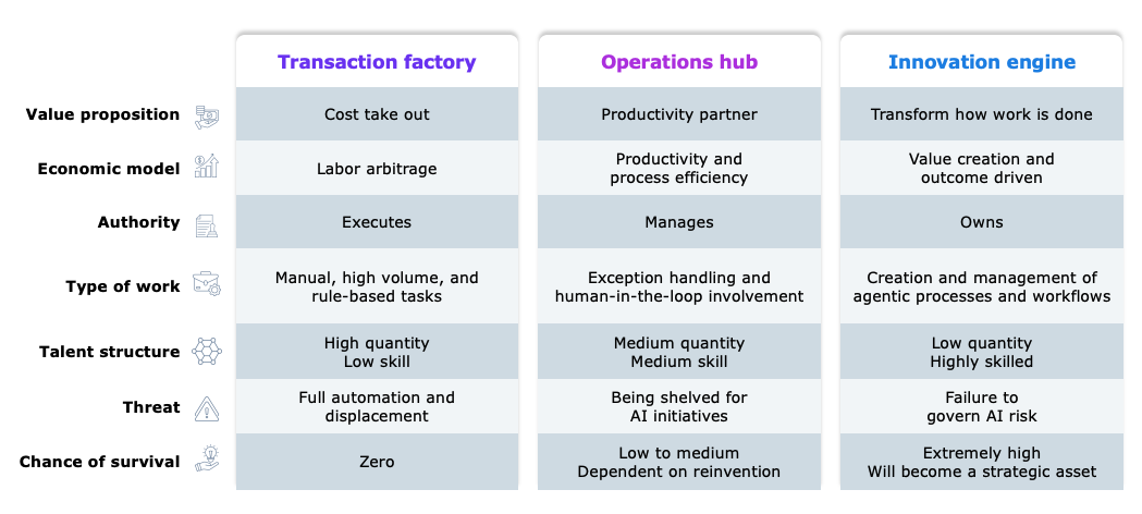 But agentic AI is pushing enterprises into a new era of value creation. Value isn’t created by scale or efficiency anymore. It’s enabled by AI’s ability to drive growth, differentiation, and competitive advantage without the need to keep adding labor costs. These are all things your GCC probably doesn’t do today, and it must become an innovation engine with AI at the core if it hopes to survive.
