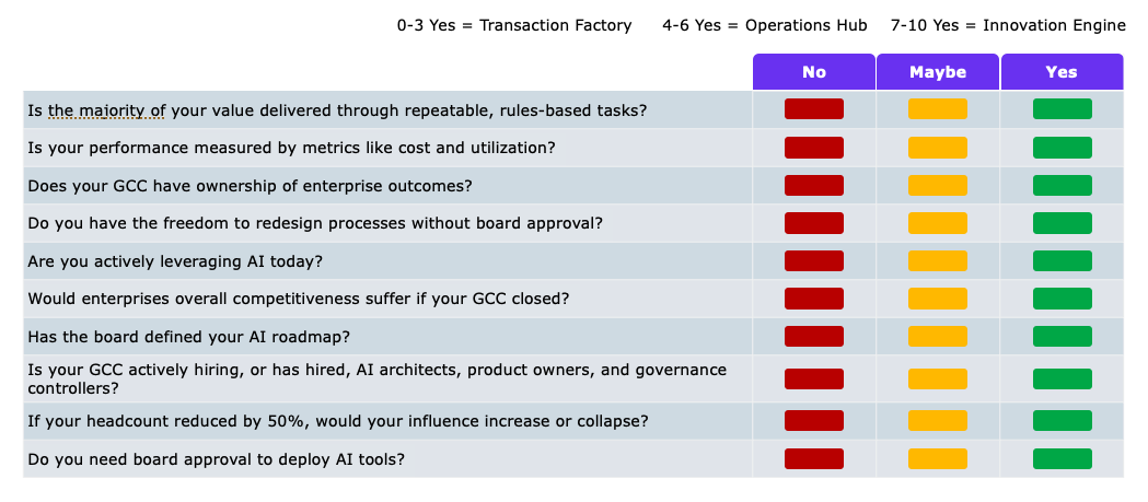 This isn’t about AI replacing every GCC, but instead boards questioning why they are funding models that don’t create a competitive advantage. That’s why some GCCs are becoming increasingly relevant, and our GCC Temperature Check will expose the realities of your situation, and we lay out how you pivot to an innovation engine.